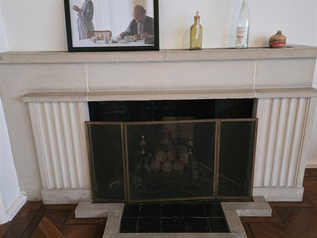 De leefruimte is afgewerkt met parketvloeren, hoge plafonds en een karaktervolle schouw.